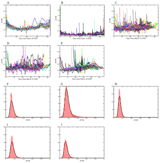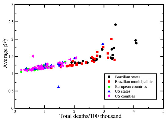 Of course not only social distancing affects the evolution of the infection rate, causing the variation observed for the Spearman’s correlation for the different localities. We note that even a small increase in , and thus, a small decrease in M, for a long period of time, results in a significant increase in mortality, as can be seen from Figure 6. Our analysis does not grasp the impact of great gatherings of individuals and the possible effect of the so-called superspreading events [20], or the implications of contact tracing.