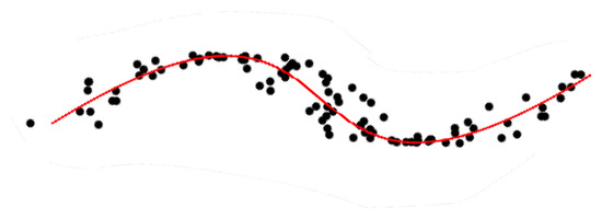 Numerous methods have been proposed in the statistics and machine learning literature to sum up information and represent data by condensed and simpler-to-understand quantities. Among those methods, principal component analysis (PCA) aims at identifying the maximal variance axes of data. This serves as a way to represent data in a more compact fashion and hopefully reveal as well as possible their variability. PCA was introduced by [1,2] and further developed by [3]. This is one of the most widely used procedures in multivariate exploratory analysis targeting dimension reduction or feature extraction. Nonetheless, PCA is a linear procedure and the need for more sophisticated nonlinear techniques has led to the notion of principal curve. Principal curves may be seen as a nonlinear generalization of the first principal component. The goal is to obtain a curve which passes “in the middle” of data, as illustrated by Figure 1. This notion of skeletonization of data clouds has been at the heart of numerous applications in many different domains, such as physics [4,5], character and speech recognition [6,7], mapping and geology [5,8,9], to name but a few.