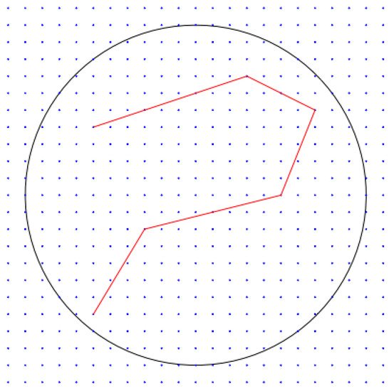 An example of a lattice in with (spacing between blue points) and (black circle). The red polygonal line is composed of vertices in .