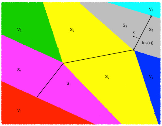 Partition. For any polygonal line with k segments, we denote by its vertices and by the line segments connecting and . In the sequel, we use to represent the polygonal line formed by connecting consecutive vertices in if no confusion arises. Let and be the Voronoi partitions of with respect to , i.e., regions consisting of all points closer to vertex or segment . Figure 5 shows an example of Voronoi partition with respect to with three segments.