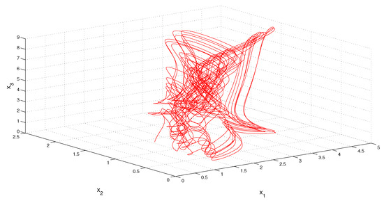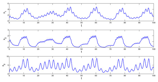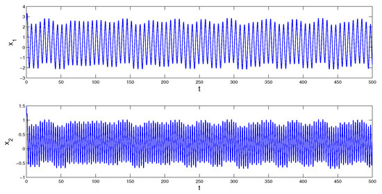 where is the Poisson stable function described in Appendix B. The perturbation is an function with the periodic component and the Poisson component The common period of the coefficient and the periodic component is Since the function is constructed on the intervals for the Poisson sequence of the function there exists a subsequence such that Therefore, the Poisson number Condition (C4) is valid with the multipliers and According to Theorem 1, the system admits a unique asymptotically stable solution, Since it is impossible to determine the initial value of the solution, we simulate a solution, which asymptotically approaches as time increases. We depict in Figure 1 the coordinates of the solution with initial values and which visualizes the MPPS solution approximately. In Figure 2 the trajectory of the solution is shown.