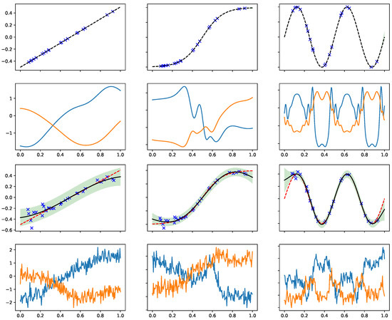 In such cases, it can be seen that is nearly a deterministic function (top row) given the sufficient amount of noiseless observations in . In fact, the left panel in the second row is equivalent to the samples from a SE kernel as is the identity function. Moving to the second column, one can see the effect of nonlinear warping generates additional kinks in the target functions. The case on the third column with periodic warping results in periodic patterns to the sampled functions.