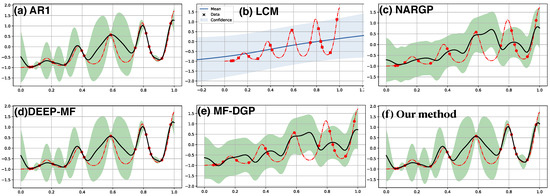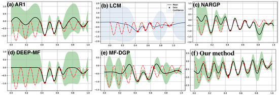The first example in Figure 2 consists of 10 random observations of the target function (red dashed line) along with 30 observations of the low fidelity function (not shown). The 30 observations of with a period 0.25 in the range of is more than sufficient to reconstruct with high confidence. In contrast, the 10 observations of f alone (shown in red dots) are difficult to reconstruct f if a GP with SE kernel is used. The above figures demonstrate the results from a set of multi-source nonparametric regression methods which incorporate the learning of into the target regression of f. Our result, the SE[SE] [panel (f)] kernel, and NARGP [panel (c)] successfully capture the periodic pattern inherited from the low fidelity function , but the target function is fully covered in the confidence region in our prediction only. On the other hand, in the input space away from the target observations, AR1 [panel (a)] and MF-DGP [panel (e)] manages to only capture part of the oscillation. Predictions in LCM [panel(b)] and DEEP-MF [panel (d)] are reasonable near the target observations but fail to capture the oscillation away from these observations.