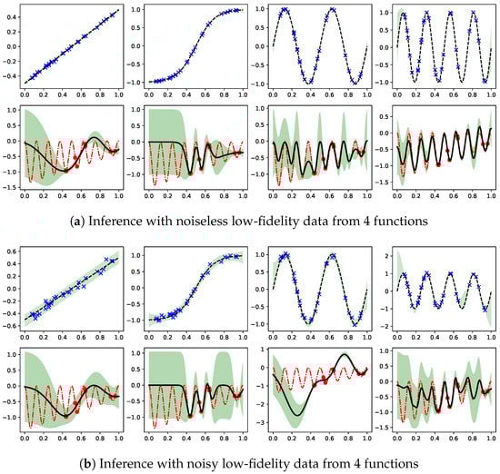 Next, the low fidelity data become the noisy observations of the same four functions. As shown in panel (b), the increased variance in also results in raising the variance in f, especially comparing the first two cases in (a) against those in (b). A dramatic difference can be found in comparing the third plot in (a) against that in (b). In (b), the presence of noise in the low fidelity data slightly raises the uncertainty in , but the ensuing inference in f generates the prediction which fails to contain most of the true target function within its model confidence. Thus, the likelihood that is the probable low fidelity function is greatly reduced by the noise in the observation. Lastly, the noise in observing as the low fidelity data does not significantly change the inferred target function.