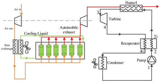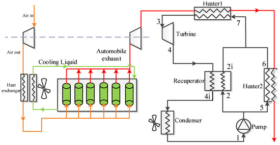 Recently, with the rapid development of economy, the demand for energy in various industries has exploded. Although there exist many types of energy sources, such as fossil energy, solar energy, and geothermal energy, fossil energy is still dominant. So far, CO2 produced by fossil fuel combustion has caused serious global warming, which attracts the attention of all countries in the world. Thus, it is urgent to improve the utilization efficiency of fossil fuel. As one of the major application fields of fossil fuel combustion, internal combustion engines (ICEs) consume a large amount of fossil oil every year. However, only 30–40% of the energy is converted into useful work [1], and a large amount of fuel heat is released through the exhaust gas and coolant of the vehicle. In general, the waste gas temperature of ICE can be up to 400–700 °C and the temperature of engine coolant is about 80–90 °C. Therefore, the recovery of high temperature exhaust heat can greatly improve the ICE efficiency and reduce fuel consumption. So far, various thermodynamic cycles have been proposed for efficiently recovering waste heat from ICE. Among these proposed cycles, the most representative technology is the organic Rankine cycle (ORC) [2,3,4], which has the advantages of simple structure and easy maintenance.