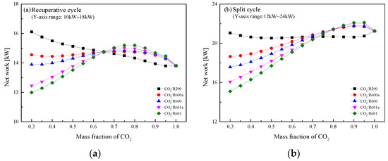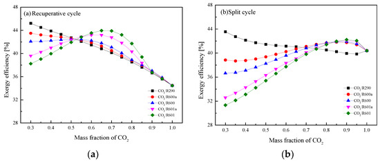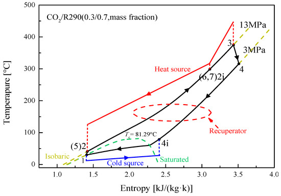 Under set operating conditions, mixture characteristics at various state points are achieved for the recuperative and the split cycle, as listed in Table A1 and Table A2 of the Appendix A for CO2/R290(0.3/0.7). The corresponding T-s diagrams for the recuperative cycle and the split cycle are respectively presented in Figure 3 and Figure 4. Based on these state properties, energy performance of five CO2-based mixtures in the recuperative cycle and the split cycle are sequentially provided in Table 6 and Table 7. From Table 6, it is observed that CO2/R600a(0.3/0.7) has the lowest turbine outlet pressure 2.88 MPa. While the highest Wnet is achieved by CO2/R290(0.3/0.7) and the lowest Wnet is obtained by CO2/R601(0.3/0.7). In terms of ηth, CO2/R290(0.3/0.7) has the highest ηth 23.74%, followed by CO2/R600a(0.3/ 0.7), CO2/R600(0.3/0.7), CO2/R601a(0.3/0.7) and CO2/R601(0.3/0.7). Thus, overall, CO2/R290 (0.3/0.7) has the best thermodynamic performance.