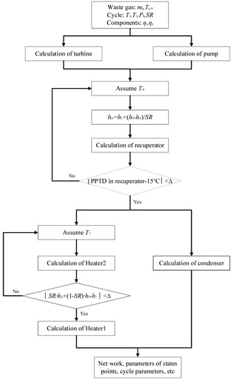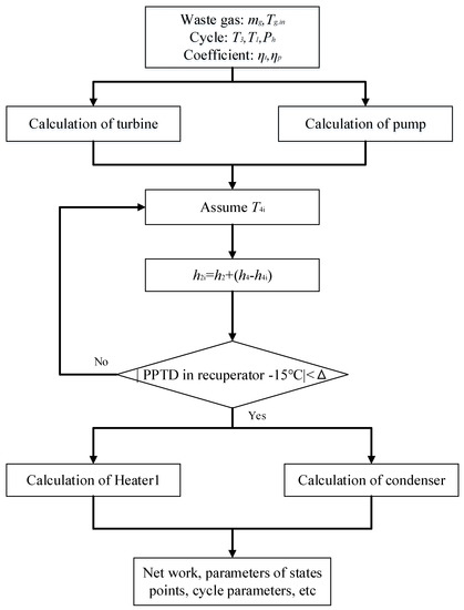 Based on the listed equations, the MATLAB platform is used for code development. The calculation flows for recuperative and split cycles are respectively given in Figure 5 and Figure 6.