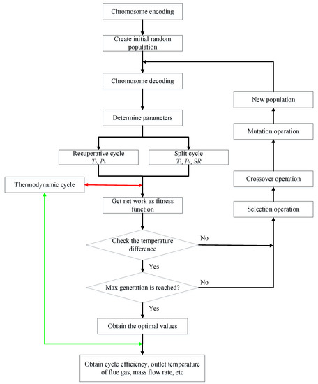 In this study, the system parameters of the two cycles are optimized by GA, due to its simplicity, versatility, and suitability for parallel processing [30,31]. Under the given ICE gas conditions, the maximum Wnet is considered as the optimization objective. For the recuperative cycle, T3 and Ph are the optimization cycle variables. However, for the split cycle, SR is added as the third variable for performance optimization. Figure 7 gives the flowchart of the GA. The GA encodes the randomly generated chromosomes of the initial population firstly. Then the chromosome is decoded to obtain the corresponding system parameters. According to these parameters, thermodynamic calculations are conducted. The fitness function for each chromosome corresponds to the output work. Afterwards, the temperature differences in recuperator and heaters are checked to guarantee the fact that the calculated temperature difference meets the required minimum value. If not, all chromosomes will be replaced by the next population, which are propagated by choice, intersection, and mutation operators. Thereafter, Wnet is obtained by recalculating the new generation. The optimization will finish when the genetic calculation is iterated to the maximum number of generations. Finally, the optimal parameters in the final population are substituted into the thermodynamic calculations to obtain the system efficiency and other parameters. In addition, the population size is programmed to 100 and the maximum number of generations is stated as 80.