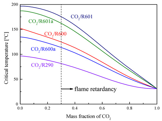 Figure 8 shows the critical temperatures of five mixtures at different CO2 fractions. It is found that the critical temperature decreases with the increase of the CO2 mass fraction. At the same CO2 fraction, the critical temperatures of five mixtures satisfy the order: R601 > R601a > R600 > R600a > R290. As for the critical pressure, Figure 9 presents the variations of these mixtures. The critical pressure firstly increases and then decreases with the increase of the CO2 mass fraction. When the CO2 fraction is larger than 0.2, the critical pressure satisfies the order: R601 > R601a > R600 > R600a > R290. In addition, it should be mentioned that the selected organic fluid is flammable. However, when CO2 is used as an addition to mix with the organic fluid, the flammability will be decreased with the increase of the CO2 fraction. According to Zabetakis’s research [19], at a CO2 mass fraction larger than 0.3, the mixture has exceeded the combustible range of R290. Although no similar data is available for other working fluids, the flammability of these five organic fluids is similar. Thus, in this study, it is thought that the five CO2-based mixtures are non-flammable, when the CO2 mass faction is no less than 0.3.