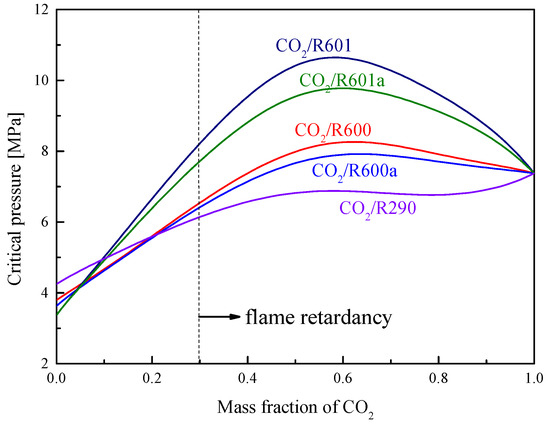 Critical pressure of mixtures under different mass fractions of CO2.