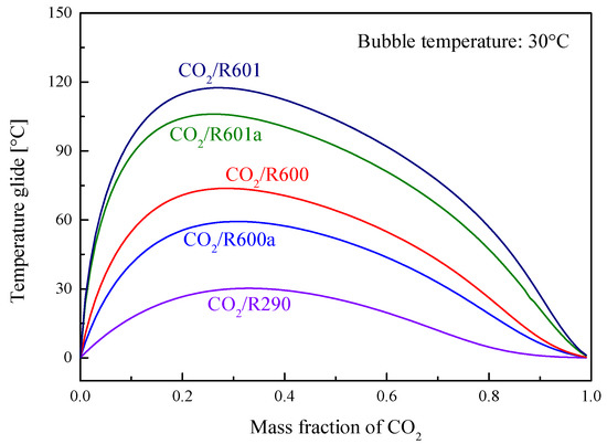 Temperature glide of mixtures under different mass fractions of CO2.