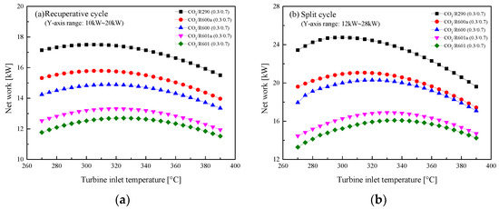 Effect of turbine inlet temperature on net work: (a) recuperative cycle, (b) split cycle.
