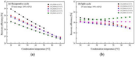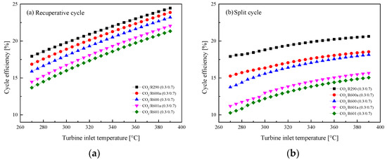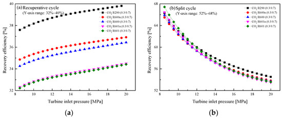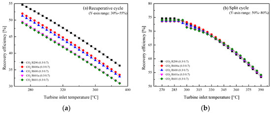 Effect of turbine inlet temperature on recovery efficiency: (a) recuperative cycle, (b) split cycle.