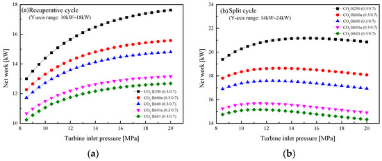 Effect of turbine inlet pressure on net work: (a) recuperative cycle, (b) split cycle.