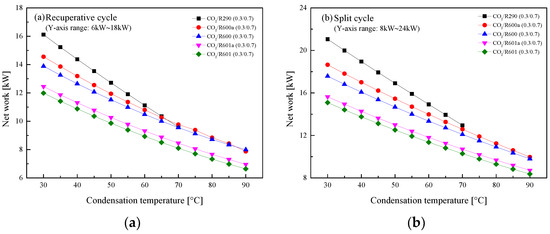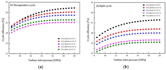 In this section, the effect of Ph on the system performance is revealed by varying the pressure settings from 8.5 MPa to 20 MPa in the step of 0.5MPa. Figure 14 shows the effects of Ph on Wnet in the recuperative cycle and the split cycle. It can be observed from Figure 14a that in the recuperative cycle, Wnet increases as Ph increases, while the growth speed gradually slows down at around 14 MPa. By comparison, the Wnet of the five mixtures is ordered by CO2/R290(0.3/0.7) > CO2/R600a(0.3/0.7) > CO2/R600(0.3/0.7) > CO2/R601a(0.3/0.7) > CO2/R60 1(0.3/0.7). As for the split cycle, when the pressure gradually increases, Wnet increases first and then decreases, as illustrated in Figure 14b. For the performance comparison, the split cycle has a larger work than the recuperative cycle for the same mixture. Taking CO2/R600a(0.3/0.7) as an example, when Ph is 16 MPa, the Wnet of the split cycle is 18.5 kW and that of the recuperative cycle is 15.42 kW. This is mainly due to a large mass flow rate of the mixture in the split cycle. The variations of ηth with Ph are shown in Figure 15. It can be seen that with the increase of Ph, ηth first increases and then remains stable in the recuperative cycle and the split cycle. Different from the comparison of Wnet, the ηth of the recuperative cycle is higher than that of the split cycle. This can be explained by the absorption of more waste heat in the split cycle.