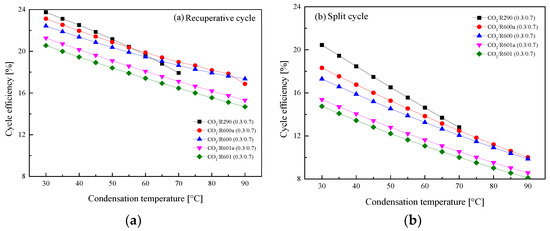 From the existing literatures, it can be found that only a few studies have compared the performance of different CO2-based mixtures in cycles with relatively simple structures. However, with the development of advanced cycles, for the utilization of CO2-based mixtures in the ICE waste heat recovery, additional studies are needed to further compare the various CO2-based mixtures’ performance in advanced cycles. Furthermore, aiming at the condensation of the transcritical cycle to recover the ICE waste heat, most researchers [24,26] just fix the condensation temperature at 20–35 °C to conduct a performance analysis. However, considering the ambient temperature, this temperature range is difficult to achieve in the mobile engine. In fact, the condensation temperature is strongly dependent on the used condensation method [27]. In total, there are three methods to condense the fluid in the waste heat recovery of ICE. (1) A separate low-temperature cooling package is employed to achieve condensation. In this case, the condensation temperature of working fluid can be low to 30 °C. (2) The working fluid is condensed by the intermediate medium. The corresponding condensation temperature can range from 50 °C to 70 °C. (3) The engine coolant is employed as the heat sink of cycle. Thus, the condensation temperature can be up to 90 °C.
