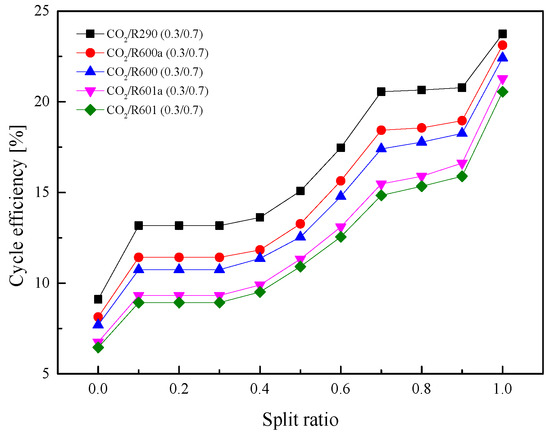 For the split cycle, Wnet and ηth of CO2/R290(0.3/0.7) are the highest, followed by CO2/R600a(0.3/0.7), CO2/R600(0.3/0.7), and CO2/R601a(0.3/0.7). It should be noted that CO2 /R601(0.3/0.7) has the largest recuperated heat 131.49 kW, but the worst thermodynamic performance. In terms of thermodynamic performance, CO2/R290(0.3/0.7) is still the first choice for the split cycle. In comparison to the recuperative cycle, the split cycle possesses a higher Wnet, as shown in Table 7. This phenomenon is attributed by a higher mass flow rate in the split cycle. Meanwhile, the exhaust gas outlet temperature of the split cycle is lower than that of the recuperative cycle. For the considered five mixtures, the exhaust gas outlet temperature of the recuperative cycle ranges from 253.35 °C to 283.92 °C, while the split cycle has a range of 139–143.5 °C. It means that the introduction of Heater2 can deeply recover the heat from the exhaust gas for the split cycle. Thus, by constructing advanced cycle structures, the output work can be increased and fuel combustion of ICE can be reduced.