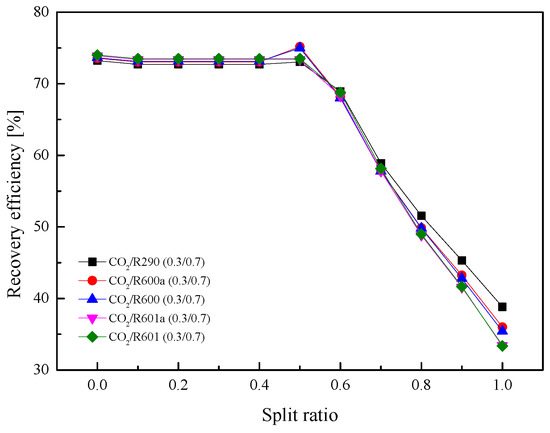 The variations of ηth with T3 are shown in Figure 12. The figure presents that ηth naturally increases with the increase of T3 in the two cycles. Although the Wnet of the split cycle is greater than that of the recuperative cycle, the split ηth is significantly lower than that of the recuperative cycle. This is due to the fact that the added Heater2 absorbs more heat from the exhaust gas in the split cycle. Among the considered five mixtures, CO2/R290(0.3/0.7) shows the best ηth, followed by CO2/R600a(0.3/0.7), CO2/R600(0.3/0.7), CO2/R601a(0.3/0.7), and CO2/R601(0.3/0.7). The effects of T3 on ηr are presented in Figure 13. It can be seen that the heat ηr decreases as T3 increases. Meanwhile, being different with efficiency curves of the recuperative cycle, the curves of the split cycle among the five mixtures are more closed with each other.