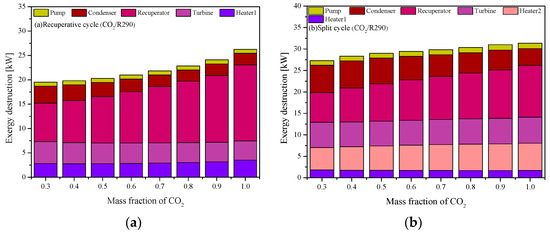 Table 8 and Table 9 respectively gives the exergy parameters of five mixtures in the recuperative cycle and split cycle under design conditions. For the exergy performance of each component, it is obvious that in the recuperative cycle, the irreversibility of the recuperator is much larger than those of other components. However, in the split cycle, the largest irreversibility is obtained by the condenser, except CO2/R290(0.3/0.7). As for the total irreversibility, compared with the recuperative cycle, the split cycle has a higher value, due to the addition of Heater2. For the considered five mixtures, the irreversibility of the split cycle ranges from 27.29 kW to 33.06 kW, while the recuperative cycle has a range of 18.9 kW–19.52 kW. In terms of ηex, the value of the split cycle is lower than that of the recuperative cycle for each mixture. Among the five mixtures, CO2/R290(0.3/0.7) has the largest efficiency in the two cycles. The corresponding values are 45.22% and 43.55%, respectively.