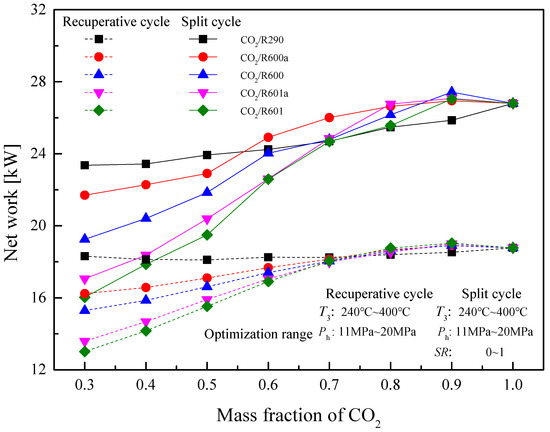 According to the conditions provided in Table 5, the recuperative cycle and the split cycle performance are derived from the established models. A synthesis of these two systems’ performances from the perspective of energy and exergy is compared. Furthermore, the effects of T3, Ph, T1, and SR on the system performance are analyzed. On this basis, these parameters of the recuperative cycle and the split cycle are optimized with the maximum Wnet as the objective. Furthermore, at different CO2 mass fractions, performance of these two cycles are optimized and compared. The detailed results and discussions are presented in the following subsections.