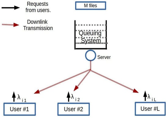 We consider a system with one server transmitting files from a fixed finite library to a set of users (Figure 1). We denote the set of users by and the set of files by . The request process for file i from user j is a Poisson process of rate , which is independent of the request processes of other files from user j and also from other users. The total arrival rate is . The requests of a file from each user are queued at the server until the user successfully receives the file. All the files are of length F bits. The server transmits at a fixed rate, R bits/s. Thus, the transmission time for each file is .