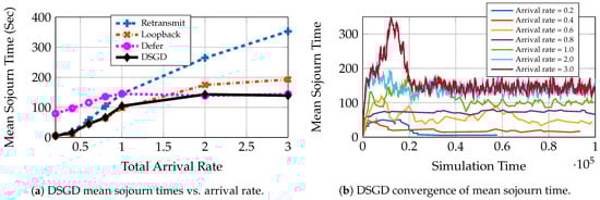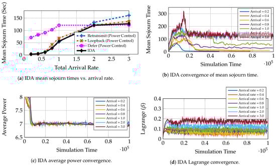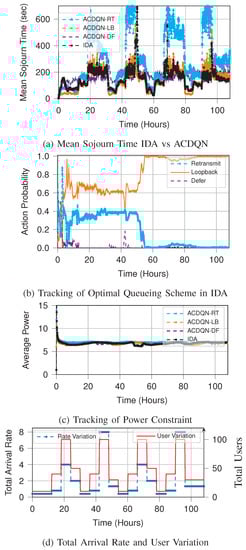 Figure 8 compares the performance tracking of IDA with respect to AC-DQN for individual queuing schemes when the arrival rate varies over time. This demonstrates the practical applicability of IDA where the environment is non-stationary. Figure 8a shows how IDA tracks the optimal mean sojourn time as the environment changes. During the first 12 h, the IDA assigns high probability to the retransmit policy. Since the traffic is very low in first 12 h, the learning process is slow. However, as the traffic picks up in the next 12 h, learning of the queuing policy and the power control policy, is accelerated, and IDA gets closer to the optimum performance among the three queuing schemes at 18 h. From there on, the learned optimal policy and power control are tracked near optimally. This can be seen in Figure 8a,b at time intervals , , , hours.