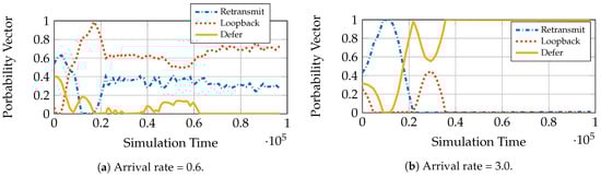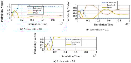 We see, from Figure 7a, that for arrival rate , the queuing policy converges to a mixed policy with probability assigned to retransmit and assigned to loopback. This policy has the same optimal mean sojourn time as achieved by the best policy, retransmit, in Figure 6a. Thus, IDA gives additional optimal points for the algorithm to choose from. From Figure 6a we see that for rate , both defer and loopback have the same performance as AC-DQN. For arrival rate (Figure 7c), however, IDA unambiguously chooses defer as the policy since it has the lowest mean sojourn time among the baselines in Figure 6a.