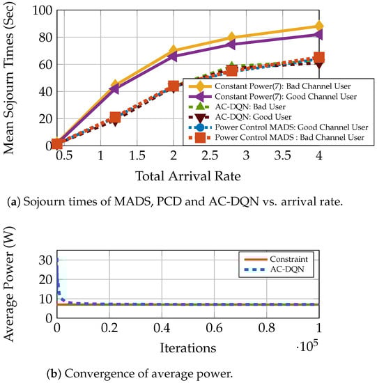 We use the loopback queuing strategy for demonstrating AC-DQN. We see in subsequent sections that AC-DQN works even for other queuing strategies. To show the advantage of power control, we split the users in two equal sized groups, where one group has good channel statistics and the other bad channel statistics. We compare the performance of both the power control policies with the constant power control policy, where the transmit power is fixed to . Figure 4a shows a comparison of the mean sojourn times of constant power policy, , MADS and AC-DQN. We see from Figure 4a that AC-DQN achieves the same mean sojourn time as that by MADS but is much better than the constant power policy. Additionally, from Figure 4b, we see that AC-DQN satisfies the average power constraint.