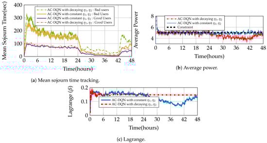 The AC-DQN provides similar improvements over the constant power scheme as above, even for a large user case [49] with the 1-LB queuing scheme. In this section, we show via simulations the tracking capabilities of AC-DQN for the large user case (Section 7.1.3). We demonstrate the importance of constant step sizes for and , and the inability of decaying step sizes to track the changing system statistics. We consider a system where the arrival rates change over a period of 48 h. We fix for the first 24 h. To make the learning harder for our algorithm, we change the rates abruptly every 6 h for the next 24 h as . This change in time period is just to illustrate the tracking ability in a more emphatic manner. This also captures the real-world scenario, where the request traffic to the base station varies with the time of the day. We fix . We calculate the mean sojourn time and average power, using a moving average window of 1000 samples in size. We run the AC-DQN algorithm for this system with (1) decaying and satisfying (17) and (2) constant step sizes, and . The rest of the parameters remain the same as in the large user case. We see in Figure 5a that the AC-DQN with a constant step size almost always outperforms the decaying step size. Specifically, after the first 24 h, the delay reduction is nearly 50 percent for a constant step size. The reason for this is evident from Figure 5b,c. We see in Figure 5c that the AC-DQN with a constant step size learns the Lagrange constant throughout the simulation time, whereas the AC-DQN decaying step size is unable to learn the Lagrange constant after the first 24 h. As can be seen in Figure 5b, this affects the average power achieved by the AC-DQN with a decaying step size. While a constant step size maintains the average power constraint of , the average power achieved by the decaying step size AC-DQN drops to 4. Hence, the decaying step size AC-DQN suffers suboptimal utilization of the available power. Thus, in practical systems, only constant step-size AC-DQN is capable of adapting to the changing system statistics. The effect of fixing the learning rates is seen in the small oscillations of average power around in Figure 5b. This is the oscillation in a small neighborhood around the optimal average power. The smaller the step size, the lesser the oscillations.