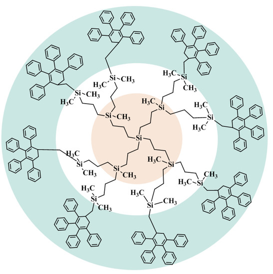 Among various dendritic macromolecules, carbosilane (Si–C) dendrimers represent one of the most important and promising classes of silicon-containing dendrimers [14,15,16]. These compounds exhibit high flexibility, manifested by low glass transition temperatures, biological inertness, and kinetic and thermodynamic stability due to the low polarity and high strength of the Si–C bond. Therefore, carbosilane dendrimers have attracted much attention as functional molecules for successful applications in electrochemistry, catalysis, and nanoengineering [17]. Polyphenylene dendrimers are highly branched monodisperse macromolecules entirely consisting of substituted benzene rings that result in their rigid, shape-persistent chemical structure [18,19,20,21]. These dendrimers can be synthetically modified by the introduction of different chemical functionalities that influence their applications [22,23]. Polyphenylene dendrimers are extremely chemical and thermal stable molecules, but with greatly increased solubility in a wide range of organic solvents [24,25]. These advantages lead to their perspective applications as active materials in OLED devices, templates for composite materials, molecular sensors, magnetically recoverable catalysts, and bioapplications [26,27,28,29,30,31,32,33,34].