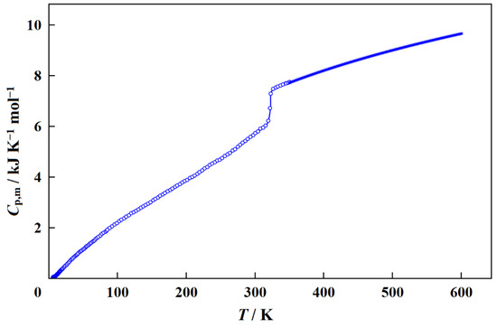 The calorimeter reliability was verified by the heat capacity measurements of the standard reference materials (benzoic acid C6H5COOH, corundum α-Al2O3, copper Cu) over the range of T = 6–350 K [47]. The relative expanded uncertainties for the heat capacity (Ur(Cp) = 0.02 below T = 15 K, Ur(Cp) = 0.005 between T = 15 and 40 K, and Ur(Cp) = 0.002 in the interval of T = 40–350 K) were evaluated on the basis of the calibration results.