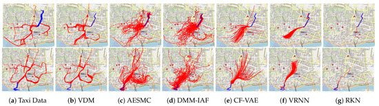 Making sense of time series data can be challenging, especially in real world data-sets that are highly multi-modal. There may be multiple plausible future projections at any given part of the observed sequence, but the average projection is often highly unlikely or even physically impossible. As an example, consider a dataset of taxi trajectories (https://www.kaggle.com/crailtap/taxi-trajectory, accessed on 1 March 2020). In each row of Figure 1a, we have selected 50 routes from the dataset with similar starting behavior (blue). Even though these routes are quite similar to each other in the first ten waypoints, the continuations of the trajectories (red) can exhibit distinct behaviors and lead to points on any far edge of the map. We see that trajectories follow a few main traffic arteries, which are the data distribution’s modes. Our goal is to learn a generative model of the data that can forecast plausible continuations for the trajectories based on some initial waypoints.