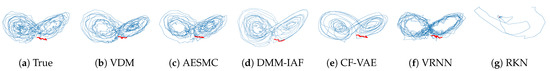 Generated samples from VDM and baselines for stochastic Lorenz attractor. The models generate the future 990 steps (blue) based on the first 10 observations (red). Due to the chaotic property, the reconstruction is impossible even the model learns the right dynamics. VDM, AESMC, and DMM-IAF capture the stochastic dynamics well, while RKN fails.