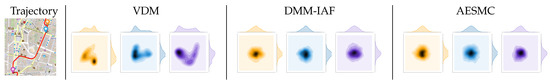 An illustration of predictive priors of taxi trajectories from VDM, DMM-IAF, and AESMC at 3 forks in the road marked on the map. VDM and AESMC both use 13 samples. VDM succeeds in capturing the multi-modal distributions, while DMM-IAF and AESMC approximate them with uni-modal distributions. For visualization, the distributions are projected to 2d with KDE.