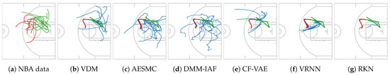 This dataset (A version of the dataset is available at https://www.stats.com/data-science/, accessed on 1 September 2020) consists of sequences of 2D coordinates describes the movements of basketball players and the ball. We extract the trajectories and cut them to a fixed length of 30 to simplify the comparisons (details in Appendix C). The task is to predict the next 20 observations given 10 initial observations. Players can move anywhere on the court and hence their movement is less structured than taxi trajectories that are constrained by the underlying street map. Due to this, the initial movement patterns are not similar enough to evaluate W-distance. VDM outperforms all baselines and other VDM variants in the multi-step prediction and one-step prediction (Table 3). Other VDM variants perform also reasonably well and better than the other sequential latent variable models. Figure 5 illustrates qualitatively that VDM (Figure 5b) and CF-VAE (Figure 5e) succeed in capturing the multi-modal dynamics. The forecasts of AESMC (Figure 5c) and DMM-IAF (Figure 5d) are less plausible (not as smooth as data). VRNN (Figure 5f) and RKN (Figure 5g) fail in capturing the multi-modality.