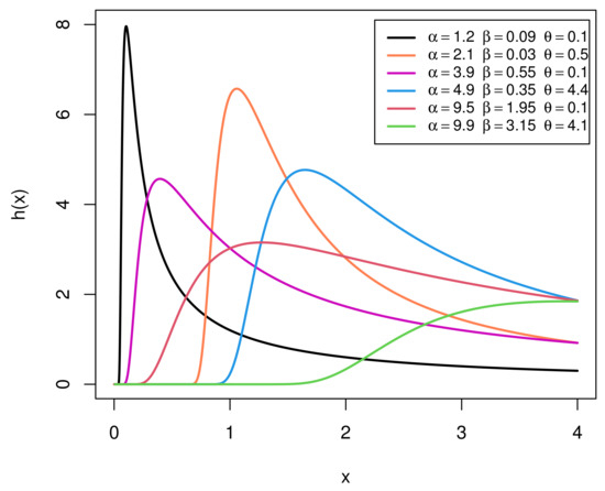 The mode of the EIGo distribution follows by differentiating the logarithm of the PDF (4), , with respect to x, and equating the result to zero. After some algebraic manipulations, the mode is determined by solving the following non-linear equation:
