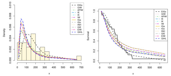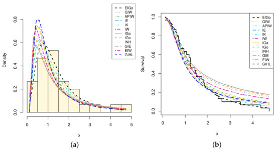 The EIGo distribution is compared with some competing distributions such as the IGo, IE [21], GIE [20], inverse-Weibull (IW) [37], inverse gamma (IGa) [38], generalized inverse-Weibull (GIW) [39], exponentiated inverted-Weibull (EIW) [40], generalized inverted half-logistic (GIHL) [41], inverted-Kumaraswamy (IK) [42], inverted Nadarajah–Haghighi (INH) [43], and alpha-power inverse-Weibull (APIW) [44] distributions. The corresponding PDFs of the competing models (for ) are written in Table 5.