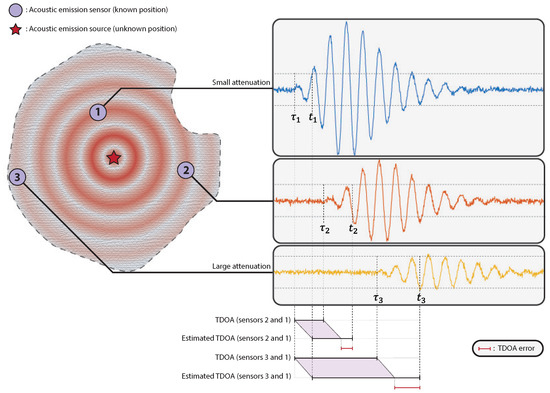 Acoustic emission testing is a non-destructive testing method used to detect several kinds of faults in structures such as piping, bridges and aerospace structures. Its main advantages over other non-destructive testing methods are the high sensibility, the wide coverage area and the possibility of monitoring structures in real time [1,2,3,4,5,6]. In the acoustic emission framework, sensors are spread over the surface to be monitored, and elastic waves emitted by passive sources (such as cracks or rivets under stress) propagate through the medium and are detected by these sensors. The segment of signal acquired by a sensor that is detected as a wave is called a hit. In order to reduce memory requirements, the sampled signals are usually not saved, only the estimated times of arrival (TOAs) are recorded and later used to estimate the source position.