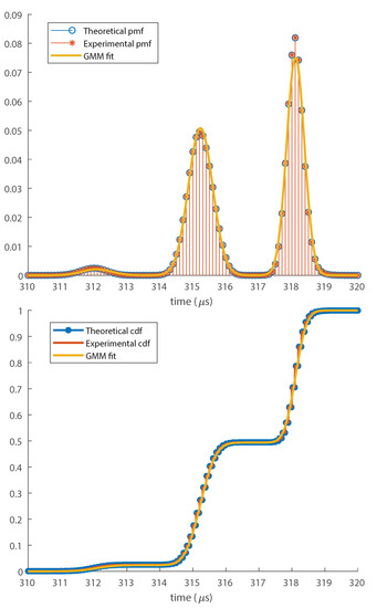 The obtained TOA pmf and cdf for this hit is shown in Figure 2. The pmf was fitted into a Gaussian Mixture Model (GMM), leading to the pdf . The details of the fitting technique we used are described in Appendix C. The cdf of the fitted distribution was plotted along with the TOA cdf, and in order to allow the comparison between the fitted pdf and , we plotted along with .