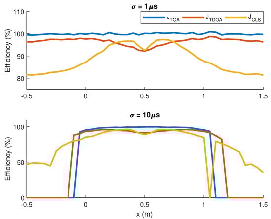 Efficiency of the source position estimators in terms of the x coordinate of the actual source position for unbiased Gaussian TOAs with standard deviation (top) and (bottom).