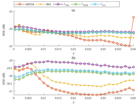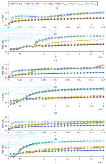 The results are shown in Figure 4e,f. With the filter, the parameters of the GMM are better estimated, and the GMTOA estimator has better performance than all other methods even for high variance. The MLE also presents much lower MSE than and for high noise level.