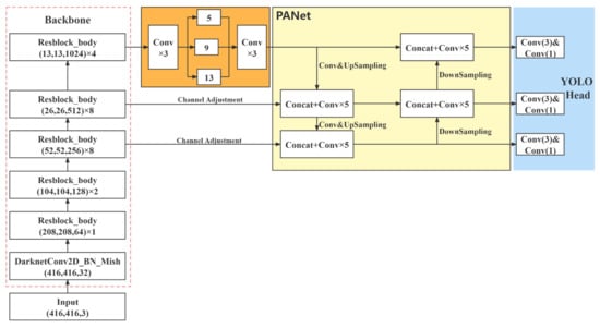 The model of YOLOv4 [33] is composed of three parts, i.e., the backbone feature extraction network (backbone), the feature pyramid (neck), and the prediction end (head). The network structure when the resolution of the input image is pixels is shown in Figure 1.