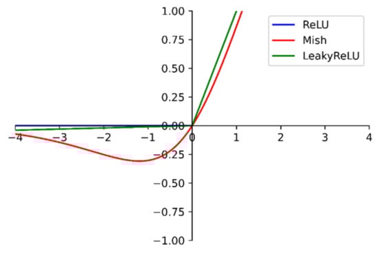 The activation function from the LeakyReLU function in Darknet53 is modified to the Mish [35]. The Mish function is shown in Figure 3.
