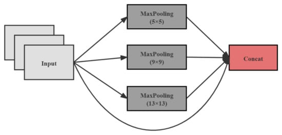 Before feature fusion, the last class of feature maps was subjected to the SPP [37] structure. The SPP structure is shown in Figure 4.
