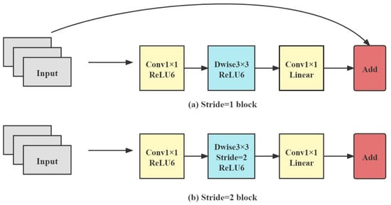 In MobileNetv2 [39], the core part is the inverse residual structure, as shown in Figure 6.
