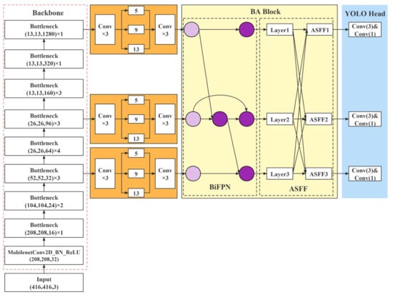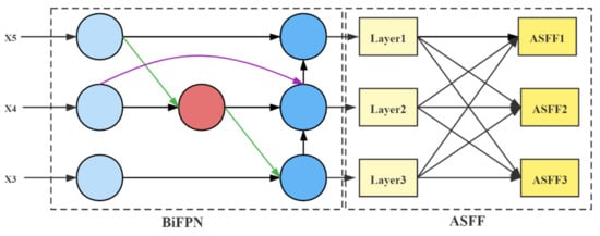 The BA module consists of the Weighted Bi-directional Feature Pyramid Network (BiFPN) [41] and the Adaptive Spatial Feature Fusion (ASFF) [42]. By introducing few parameters, the detection effect was improved. Following the initial cross-scale weighted feature fusion by BiFPN, the features were imported to ASFF for a more profound integration of pest information. Figure 8 illustrates the structure of the BA Block.