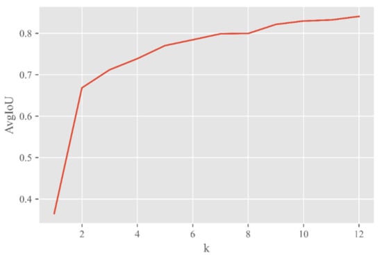 Most of the target frames in the pest dataset occupied less than 2% of the whole image, so the network needed to pay more attention to targets of small sizes. However, the anchor frames preset by the YOLOv4 model were based on the COCO dataset and were not suitable for small target detection. Therefore, this paper used the K-means algorithm for clustering analysis. With the clustering center k varying from 1 to 12, the average intersection over union (AvgIoU) was used as a measure to select the appropriate k value and reset the size of the candidate box. The variation curve shown in Figure 10 was obtained.