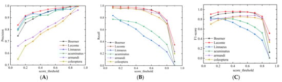 (A–C) Change curves of precision, recall, and F1-score, respectively.