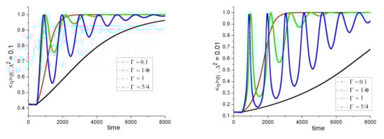 Observable <η>(t) averaged over 103 iterations with different random initial conditions and values of Γ (scaled with τ), Δ2 = 0.1 (left), Δ2 = 0.01 (right), time scale: τ = 500.