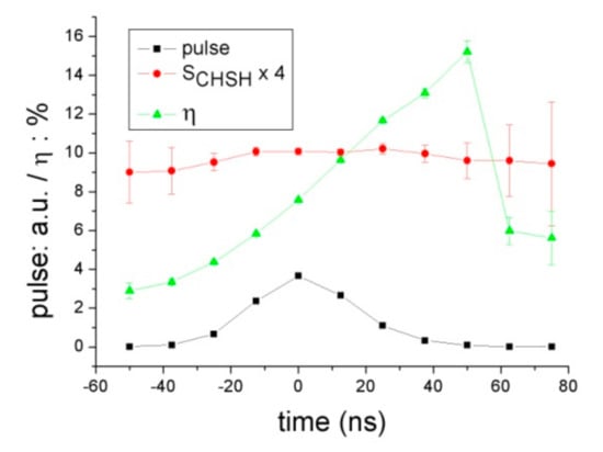Observed <η>(t) (in %) and SCHSH(t) (×4, for clarity of figure) in the 2012 experiment [], τres = 12.5 ns, τ = 0.27 ns, Rp = 60 KHz, station B. Single counts are also plotted (in arbitrary units), to indicate pulse duration (35 ns FWHM), shape, and position. The best fit to the (assumed linear) slope of <η>(t) is 1.2 × 10−3 ns−1, average SCHSH = 2.635.